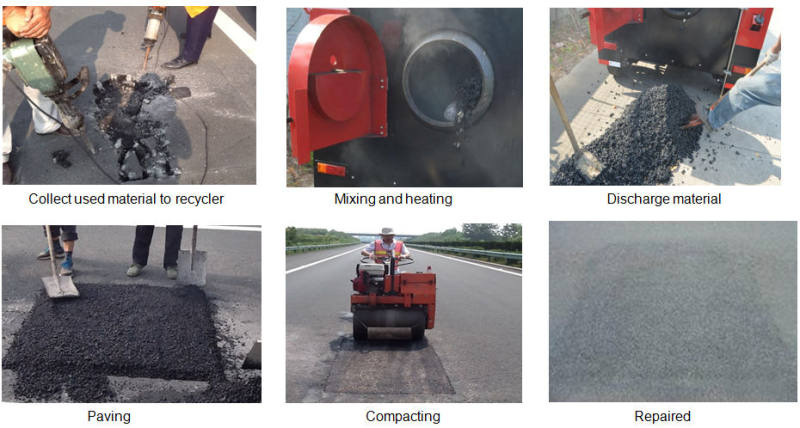 Asphalt recycler is an asphalt pavement repair equipment used for mixing, heating, and recycling asphalt mixture; It’s composed of drum, heating system, controller, bitumen emulsion sprayer, hot bitumen melter, engine and chassis. It’s suitable for the repair of potholes, alligator cracks, bumps, ruts, large cracks, and other asphalt pavement distresses.